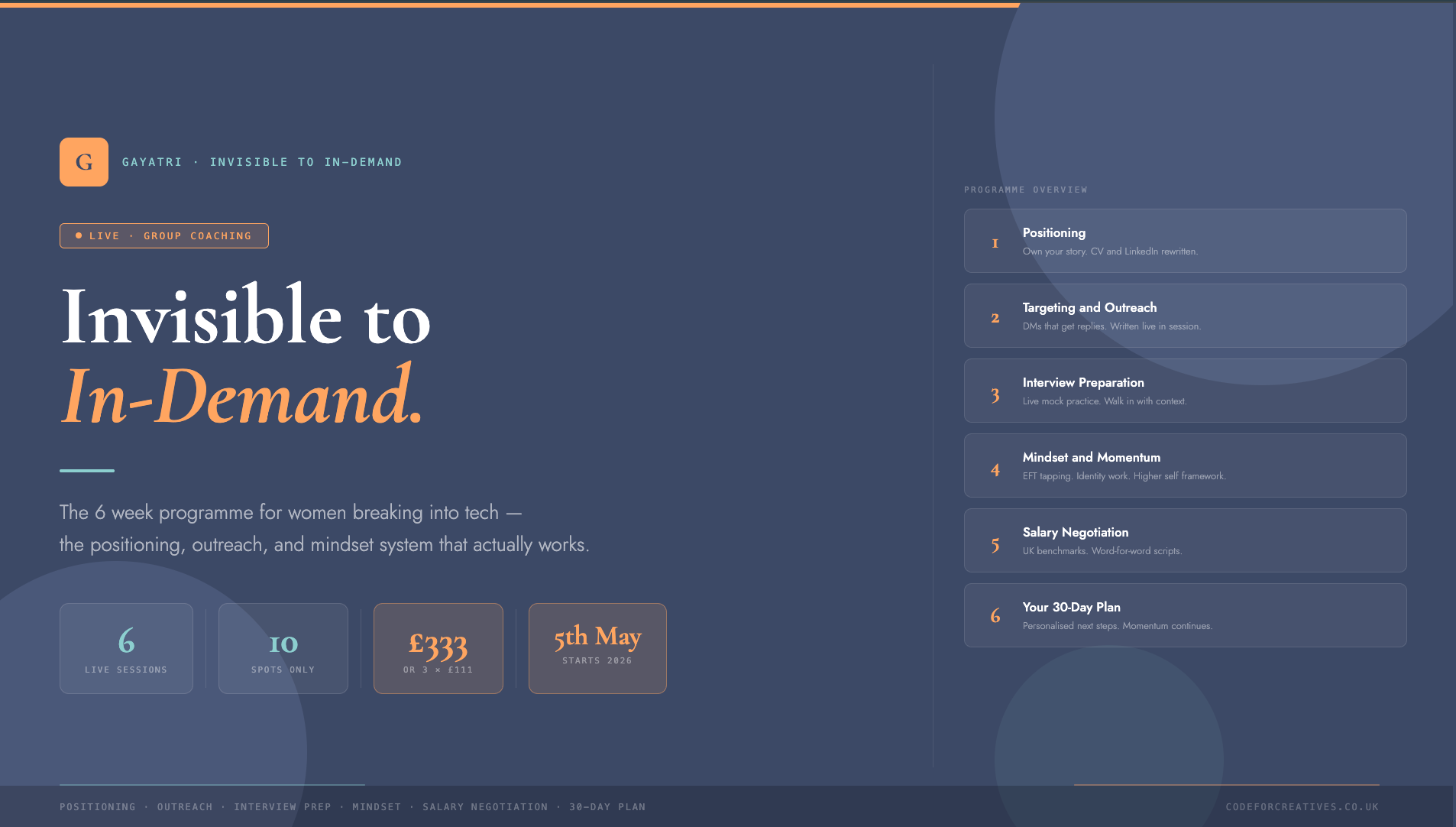 The 6 week live group coaching programme for women breaking into tech — with the positioning, outreach, and mindset system that actually works for non-traditional candidates.